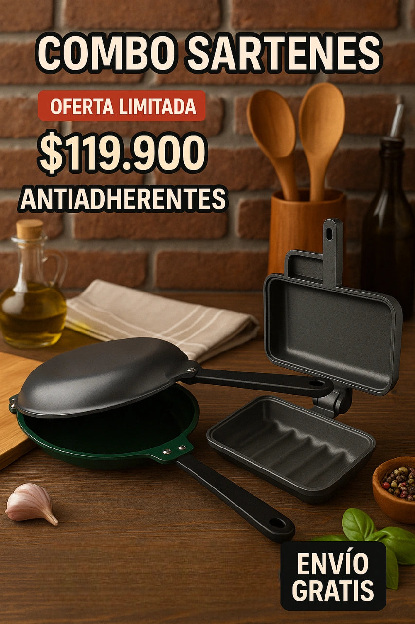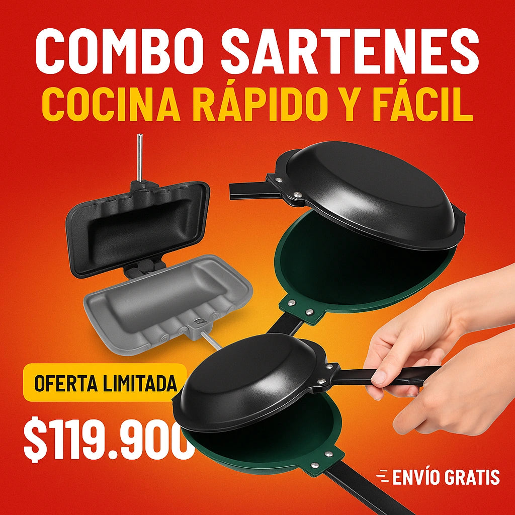 El Combo Sartenes te permite cocinar más rápido y sin complicaciones. Solo cierras, giras y listo: tortillas, carnes y sándwiches perfectos en minutos. No necesitas habilidades especiales ni pasar horas en la cocina. Son fáciles de usar, se limpian en segundos y funcionan en cualquier tipo de estufa. Cocinar nunca fue tan simple.
