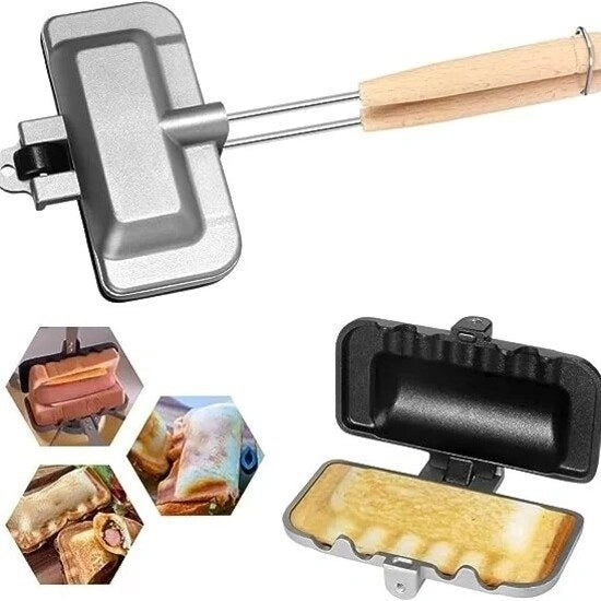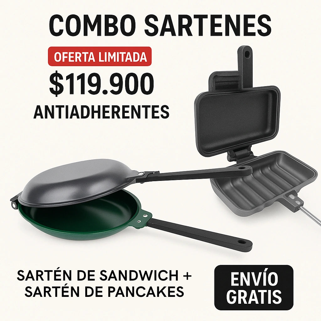 El combo incluye una sartén de doble cara y una sartén para sándwiches, ambas con recubrimiento antiadherente y mangos resistentes al calor.