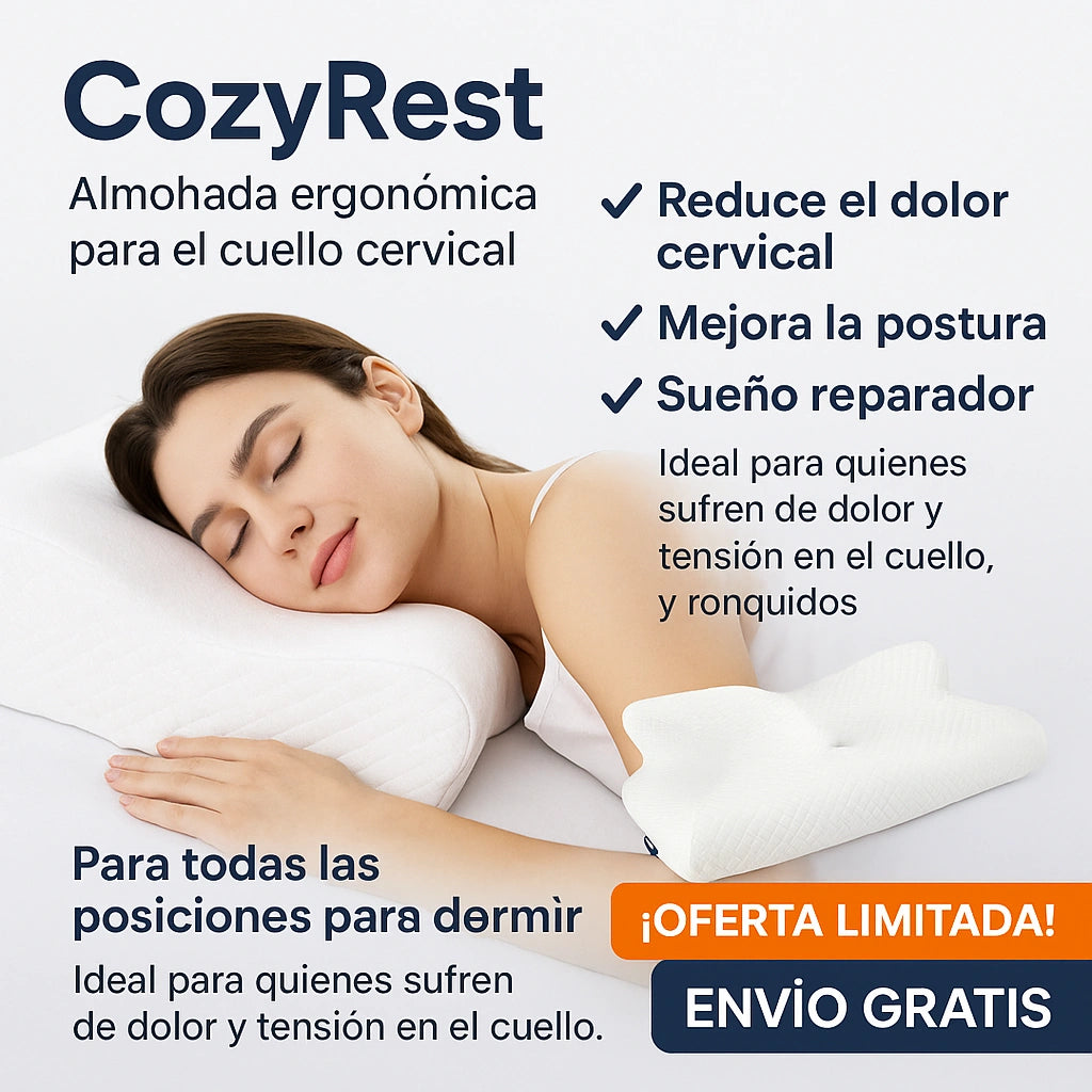CozyRest combina espuma viscoelástica de alta densidad y diseño ergonómico tipo mariposa para alinear cuello y columna, aliviar dolores cervicales y reducir tensiones. Su funda transpirable evita sudoraciones y se adapta a cualquier postura al dormir, brindando un descanso más cómodo y saludable.