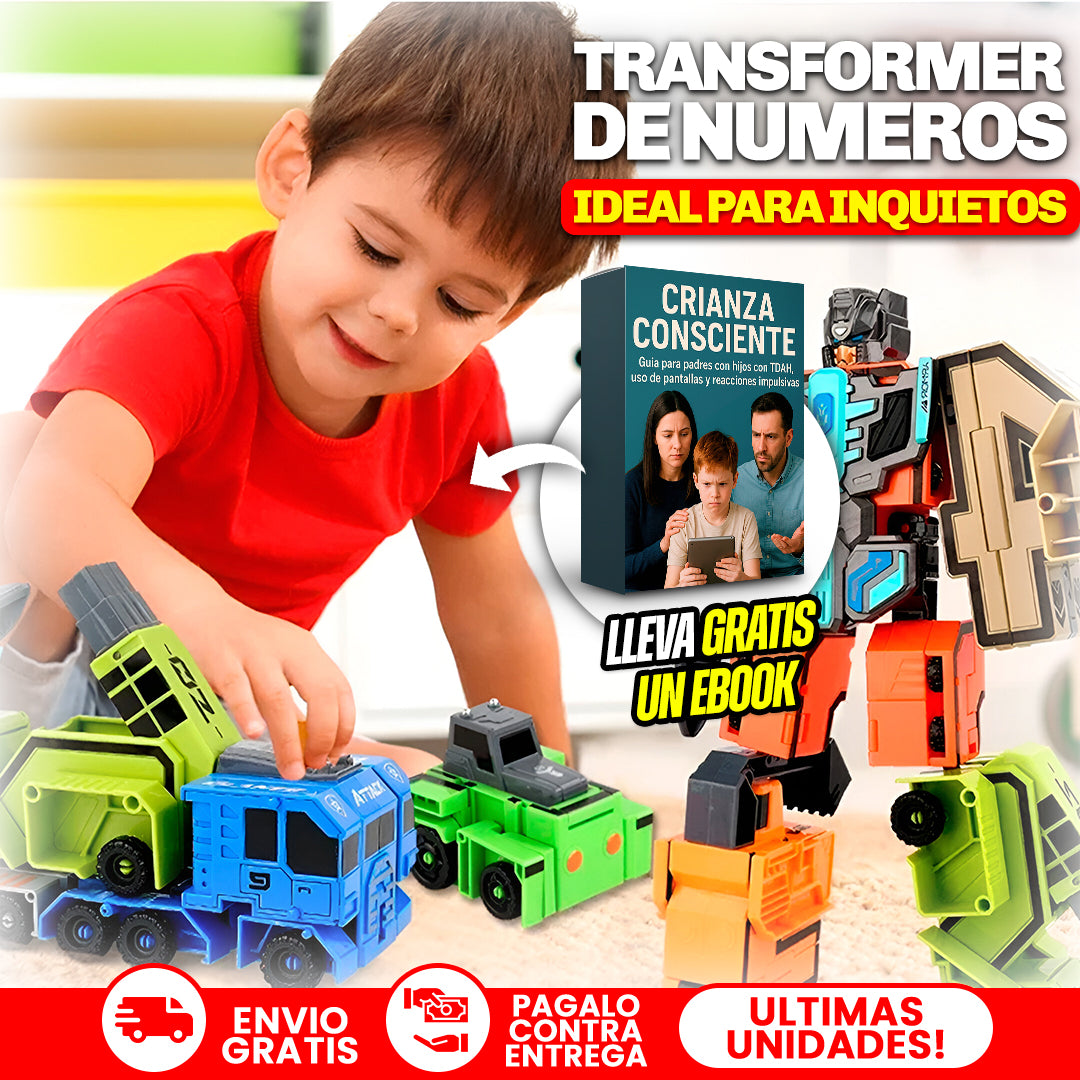El Transformer Números es más que un juguete: es una herramienta para niños con TDAH. Su sistema de transformación entre vehículo y robot estimula la atención sostenida, el pensamiento lógico y la coordinación motriz, mientras mantiene a tu hijo activo y enfocado. Está fabricado con materiales seguros, sin pantallas, baterías ni ruidos, evitando la sobreestimulación digital que tanto afecta a los niños con déficit de atención. Este set promueve el juego estructurado, repetitivo y creativo, ideal para canalizar la energía de forma positiva y fortalecer su desarrollo cognitivo y emocional.